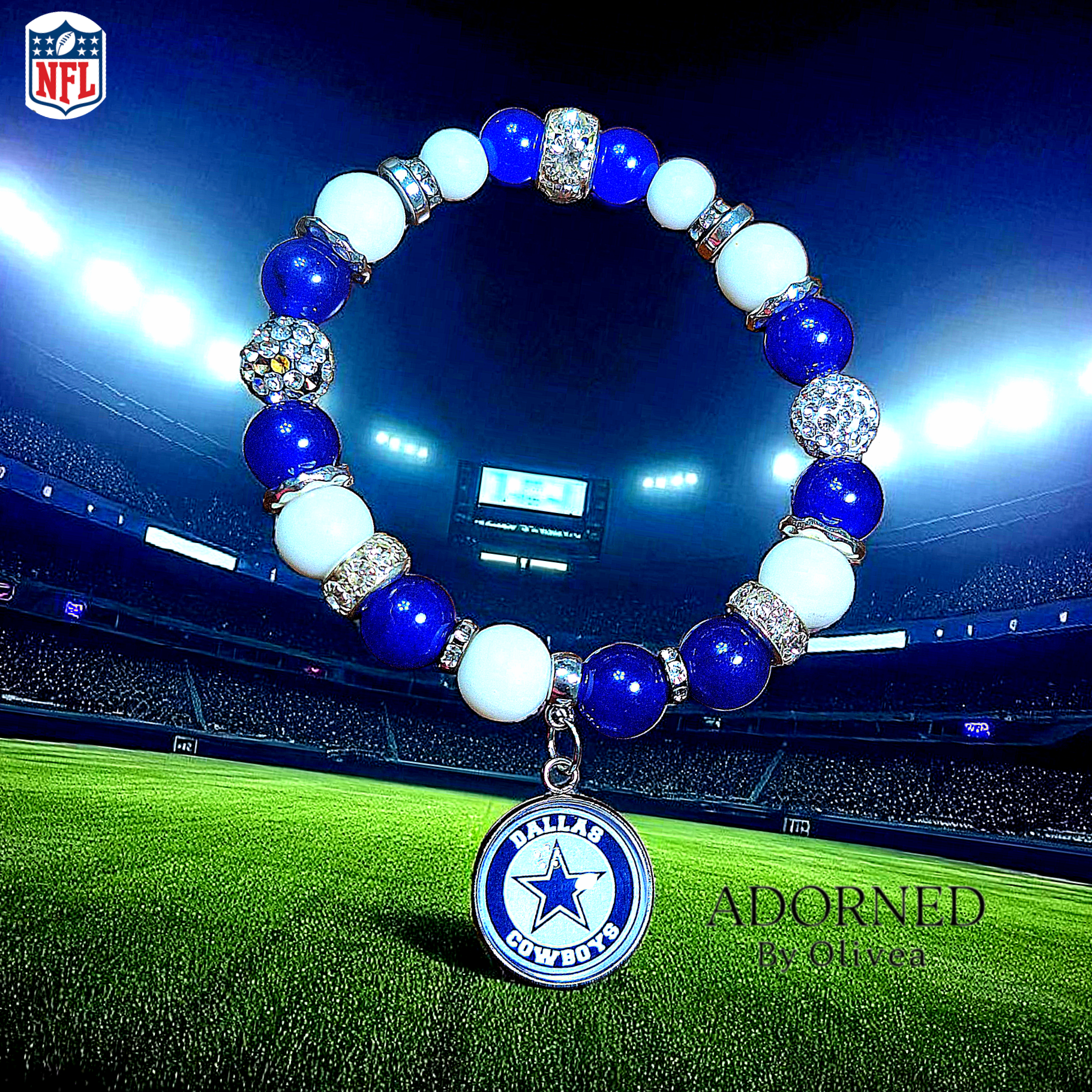 A Dallas Cowboys bracelet featuring: White Matte Stones and Royal Blue Natural Stones. This is a bold and spirited piece of jewelry that reflects the team's iconic colors and loyal fan base.