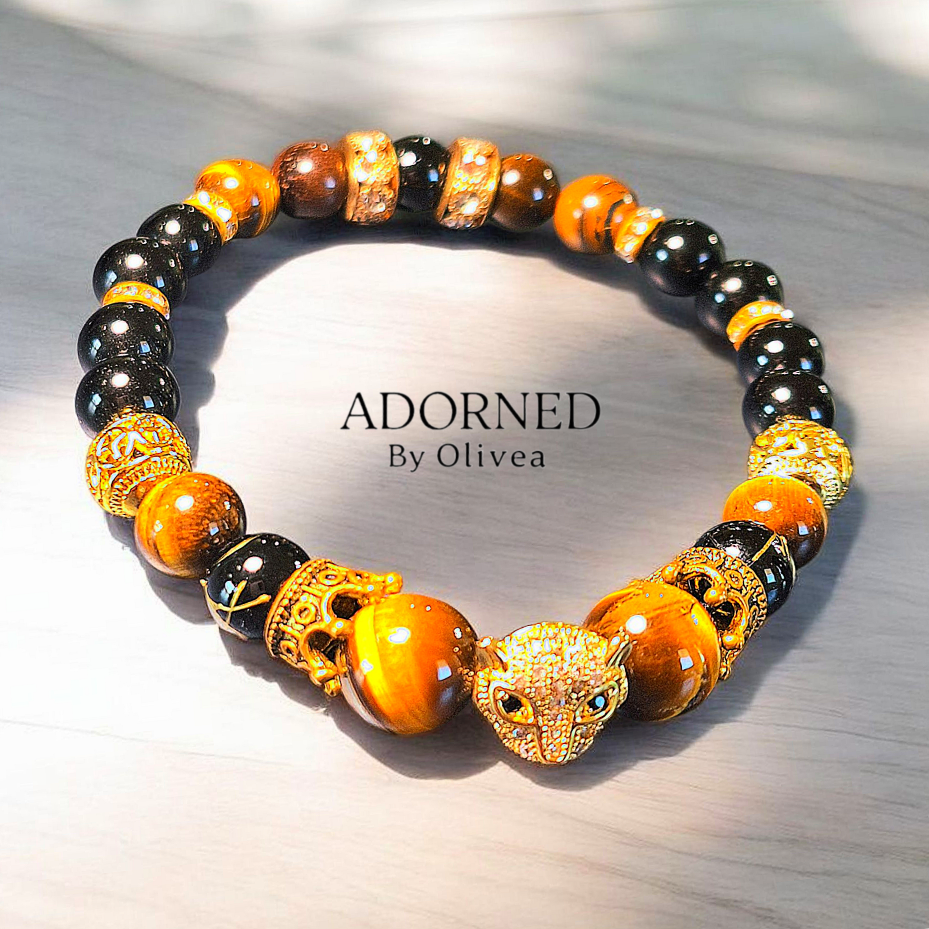 A sophisticated KM Bracelet featuring: Black Agate Onyx Stones, Black/Golden Wire Agate Stones, and Yellow Tiger Eye Stones. This custom handcrafted design could only be for ADorning a man of distinction.
