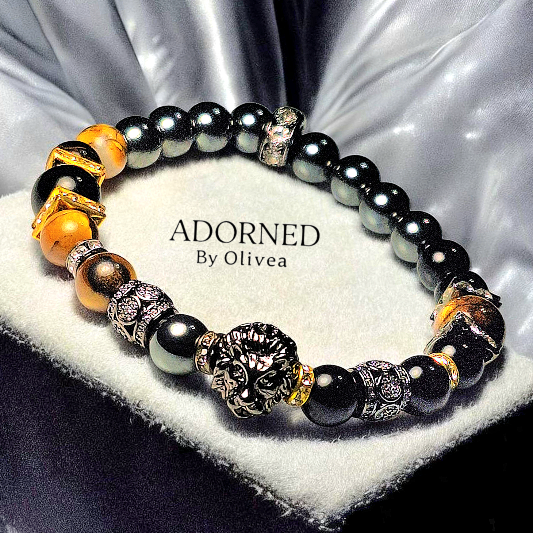 A sophisticated KM Bracelet featuring: Black Obsidian Stones, Natural Hematite Stones, and Yellow Tiger Eye Stones. This custom handcrafted design could only be for ADorning a man of distinction.