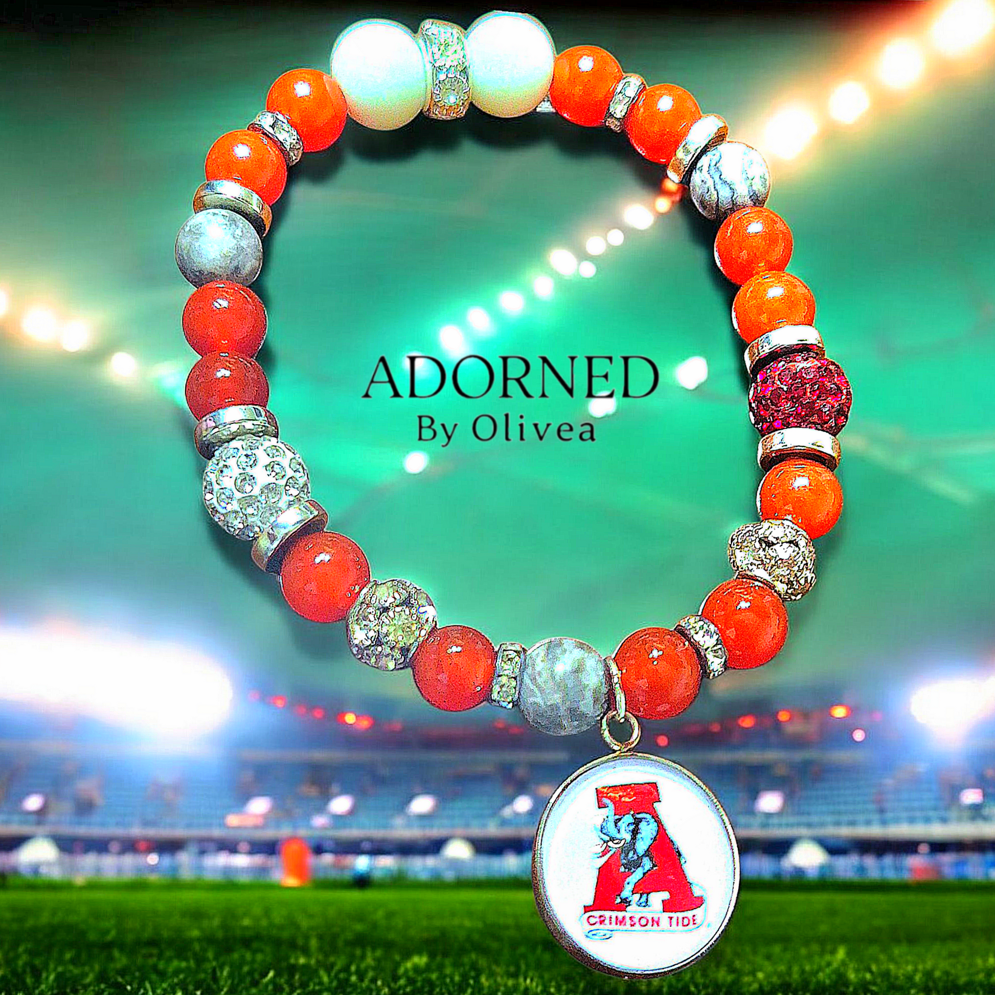 A University of Alabama bracelet featuring: White Matte Stones, Natural Red Cornelian Gemstones, and Natural Map Jasper Gemstones. This is a bold and spirited piece of jewelry that reflects the team's iconic colors and loyal fan base.