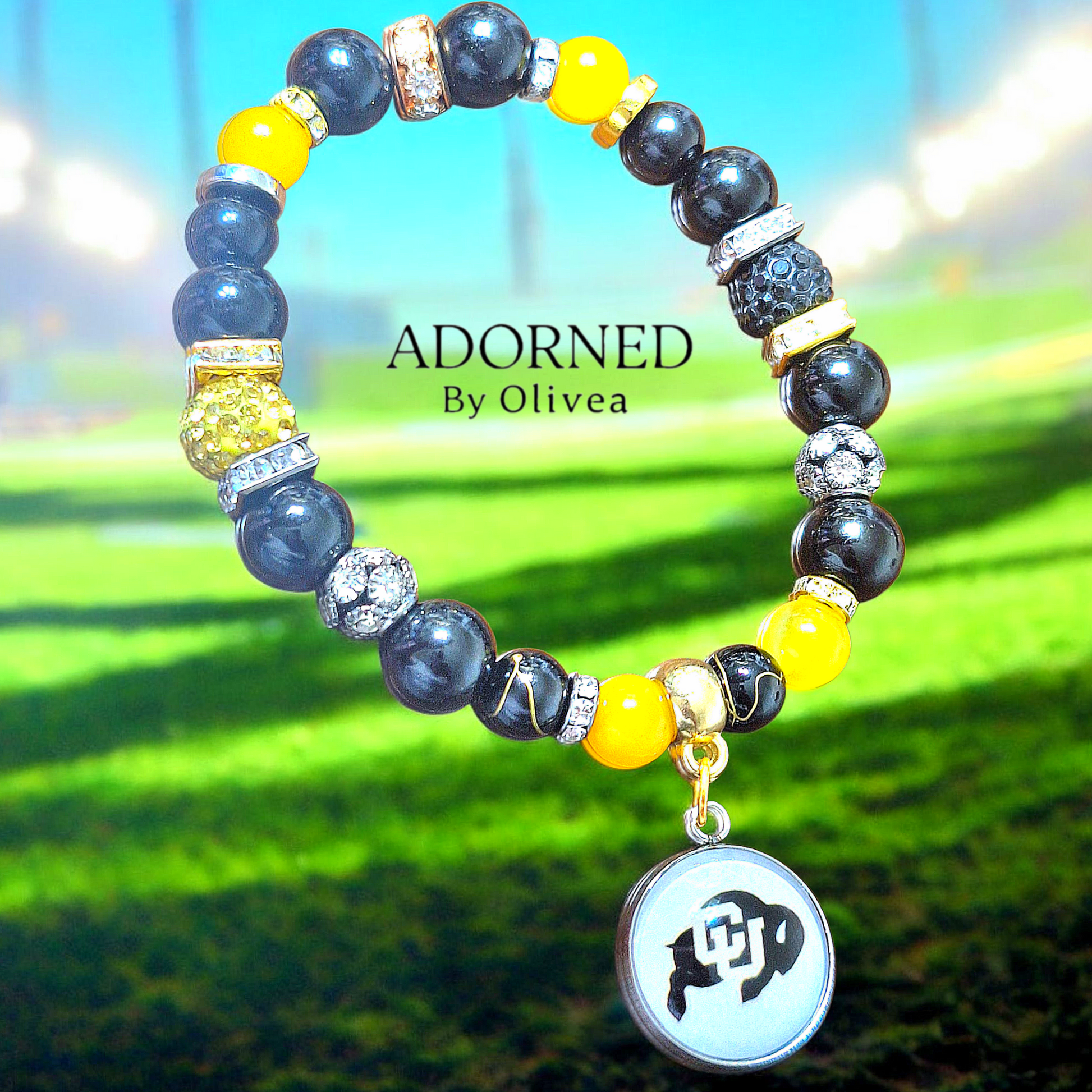 A University of Colorado bracelet featuring: Yellow Agate Stones, Black/Golden Wire Agate Stones, and Black Onyx Gemstones. This is a bold and spirited piece of jewelry that reflects the team's iconic colors and loyal fan base.